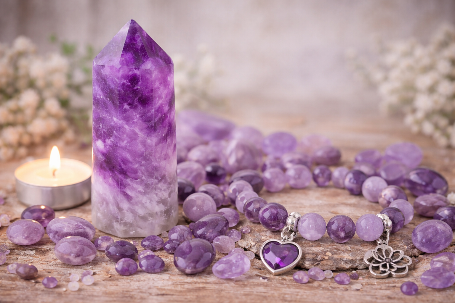 Аметистовите мъниста и висулки се нанизват лесно на корда или силиконов ластик. Гривни, колиета и обеци с аметист добавят нотка на елегантност към всеки стил — от ежедневен бохо до класически. Камъкът се съчетава особено добре с розово злато и сребро.