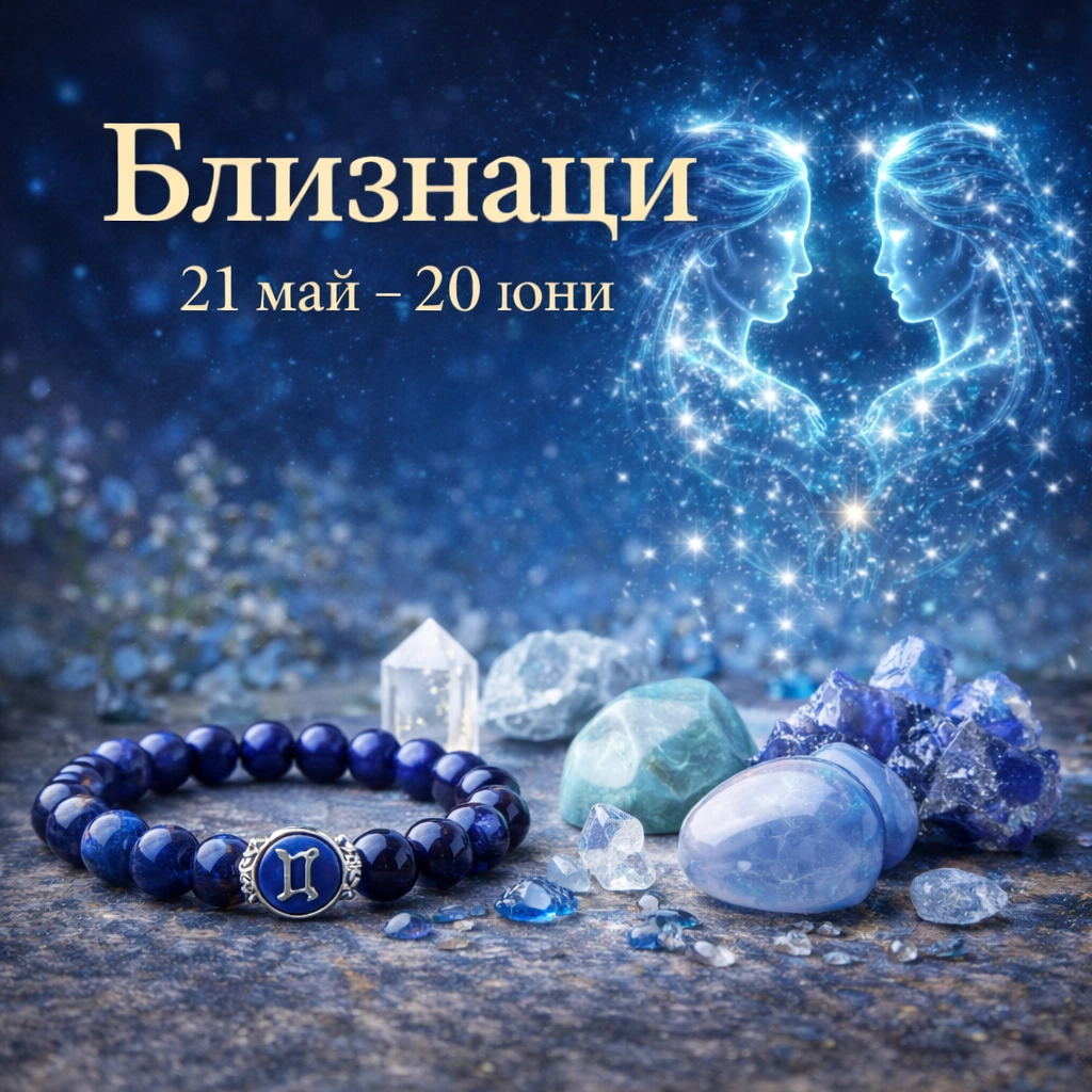 Близнаци е знакът на въздуха, комуникацията и вечното любопитство. Управляван от Меркурий — планетата на ума и словото — Близнаци е бърз, адаптивен и неуморно жаден за нови идеи. Неговите камъни са избрани да насочат тази искряща енергия, да успокоят вечно активния ум и да подкрепят дълбокото общуване.