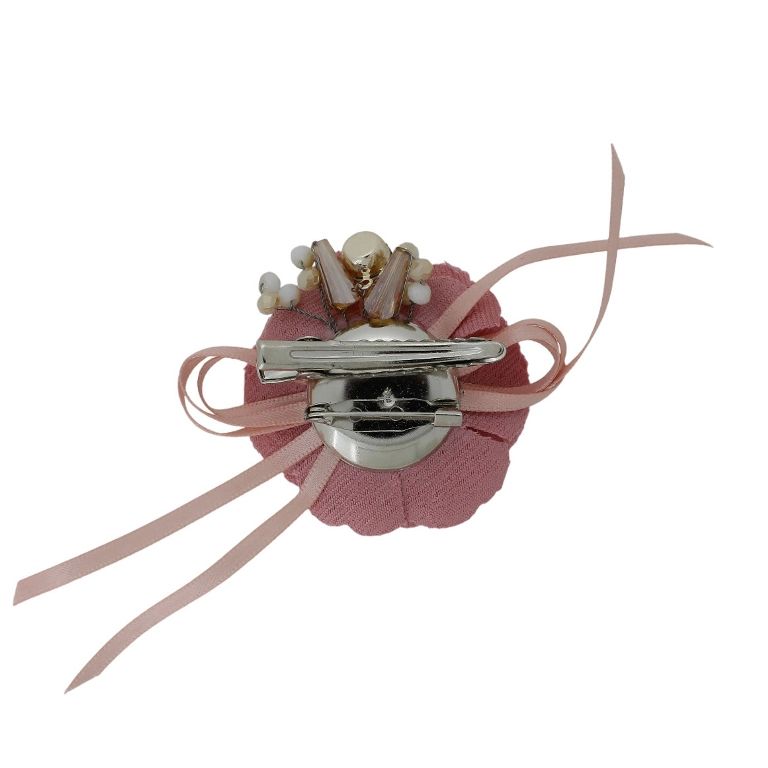 JEWELRY - BROOCH HANDMADE - METAL AND TEXTILE - FLOWER В285 - 6.9x3.8cm NICKEL-ROSE DUST-WHITE - PACKAGE 6pcs.