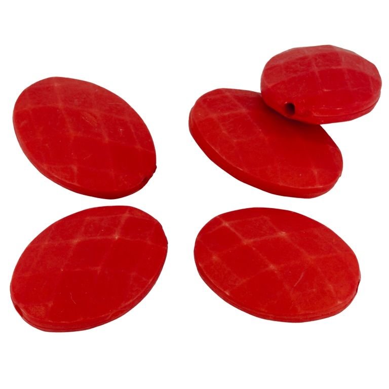ПЛЪТНИ ПЛАСТМАСОВИ МЪНИСТА - МАТИРАНИ - ПЛОЧКА ОВАЛ ФАСЕ - 32х23х10мм ЧЕРВЕНО - ПАКЕТ 500 гр. Отвор-2.5мм (110 бр.)