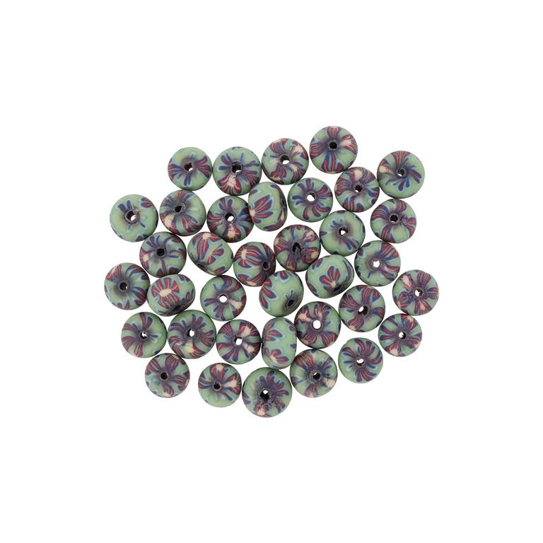 МЪНИСТА ОТ ПОЛИМЕРНА ГЛИНА ФИМО - ТОПЧЕ СПЛЕСНАТО - ЦВЕТЕ 14 - 6х10мм ЗЕЛЕНО СВ.-ЧЕРВЕНО-СИНЬО Т. - 50 бр. Отвор-1.8мм